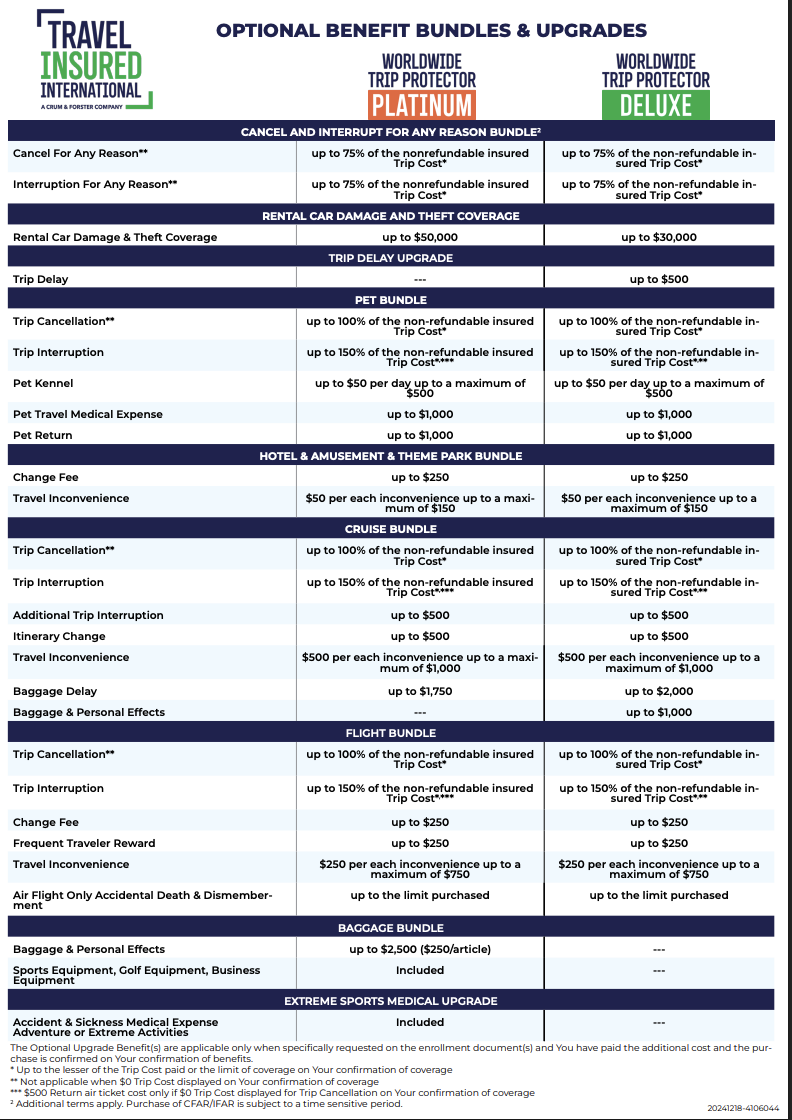 • Optional - Travel insurance is available to protect your investment, remember travel insurance is the only way to protect your travel investment.